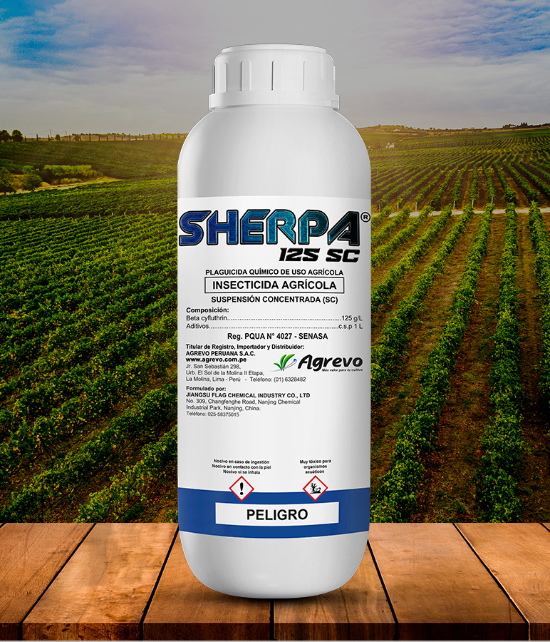 Descripción: SHERPA 125 SC, es un insecticida que actúa por contacto e ingestión. Beta cyfluthrin interactúa con los canales de sodio en las membranas del sistema de conducción de estímulos provocando un tren de impulsos y la liberación continua de acetilcolina.